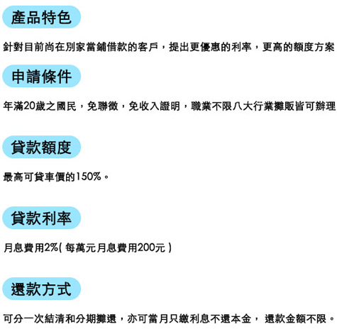 2.利息(以當舖法規定為準) : 月息最低1%~最高2.5%[年利率最低12%最高30%] (提早結清以日計算,無違約金)
